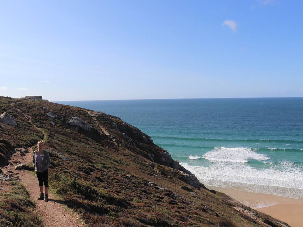 We stappen van onze fiets en gaan te voet verder. We staan bovenaan de afgrond en zien een klein paadje langs de rand die bedoeld is voor avonturiers zoals wij. We lopen het pad af en worden getrakteerd op wonderbaarlijke en gehavende kliffen die we op veilige afstand mooi kunnen bekijken. Na een half uurtje wandelen spotten we in de verte ook een paar onnatuurlijke objecten. Het blijken bunkers uit de tweede wereldoorlog te zijn. Waar ik er op de Normandische stranden meer had verwacht dan er uiteindelijk waren, zijn er hier een hoop en konden we ze ook nog eens van heel dichtbij bekijken. Het verbaast me even dat zelfs hier deze verdedigingswerken te vinden zijn, maar dan besef ik me dat ik in het museum in Normandië geleerd heb dat de Atlantikwall, de 5000 km lange verdedigingslinie die Duitsland in de bezette gebieden heeft aangelegd, helemaal van Noorwegen tot de grens van Spanje liep. Deze punt is natuurlijk behalve een prachtige, ook een strategisch belangrijke locatie. Dit geeft de spannende en wonderlijke wandeling langs deze kust nog een extra lading.